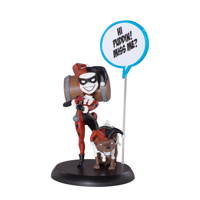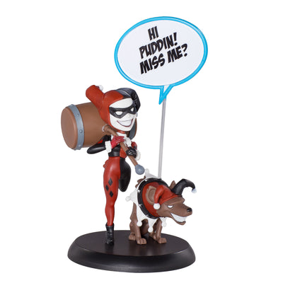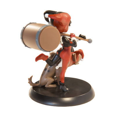 The detailed DC Comics Q-Fig Harley Quinn Figure shows the supervillain in the classic outfit from the DC Animated Universe along with one of her hyenas. Unfortunately, we couldn't find out whether it is Bud or Lou, as we can't get closer to the predator than a few meters. But even without the bundle of fur, teeth, and claws, Harley knows how to help herself, as the gigantic hammer she has shouldered shows. ;)