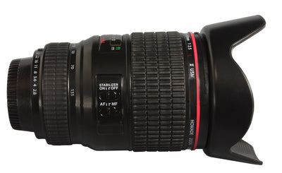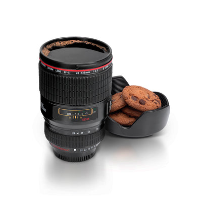 The lens hood also serves a different purpose with the camera lens drinking cup. You can use the hood as a plate and store cookies on it during a cozy coffee break - or you can keep the photographer's drink of your choice warm by placing the hood on the cup (when used as a lid, however, it cannot be screwed on tightly).