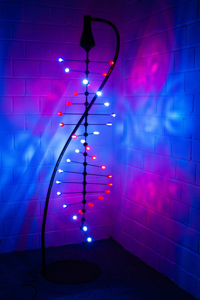 The illuminated LED helix is designed in such a way that it is very similar to the structural model of a DNA molecule. If you like, the red LEDs represent the oxygen-containing DNA molecules. nucleic bases and the blue LEDs represent the nitrogenous ones. But that's not all: every 45 seconds, an integrated, virtually silent motor releases an impulse of kinetic energy that causes the helix chain to rotate around itself - just as is often depicted in animated images of deoxyribonucleic acid (see, there's that word again!). Incidentally, this movement creates beautiful lighting effects on the walls, especially in darkened rooms. Take a look at the video to get a small impression.