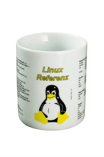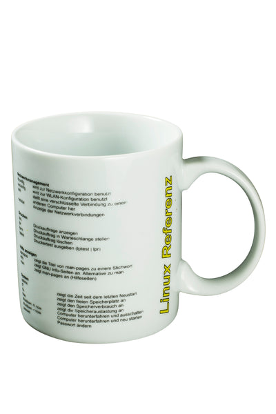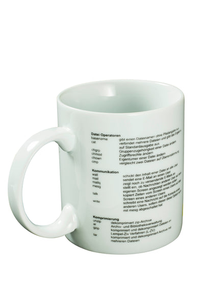 On this mug, important commands for Linux are printed, so you can comfortably learn and practice with a coffee, tea, or hot cocoa at the computer.