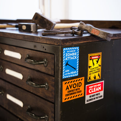Wie uns der Film Zombieland gezeigt hat, lässt sich eine Zombieapokalypse überleben, sofern man sich an ein paar essentielle Regeln hält. Damit Du und die Noch-Menschen in Deiner Umgebung möglichst lange gegen die wandelnden Leichen bestehen können, haben wir beschlossen, eine Reihe von magnetischen Zombie-Warnschildern zu entwickeln. Diese Schilder lassen nicht nur die Herzen eines jeden Horrorfans höher schlagen, sie erhöhen außerdem die Überlebenschancen um exakt 83 Prozent.