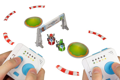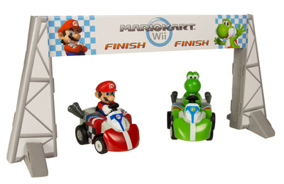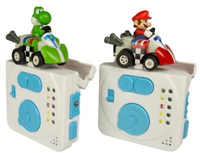 The Mariokart Racer car racing game comes to you as a complete set. All you have to do is briefly charge the two cars, put the cardboard course together and then you're ready to go.