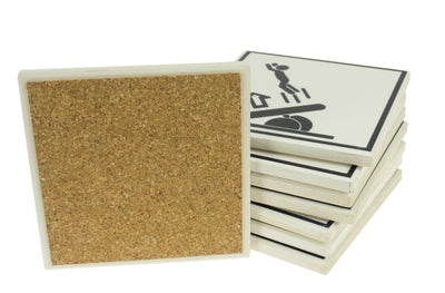 The top half of the Portal Coasters is made of ceramic, while the underside is lined with cork to protect the surroundings from damage. Additionally, important warning signs are printed on the surface to constantly remind the test subject of the ever-present dangers, such as falling objects, toxic liquids, or rogue turrets.