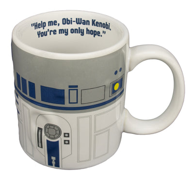 To new Star Wars fans and those who are just about to become fans, the quote printed on the inside should be explained briefly: Princess Leia used the droid to deliver the stolen construction plans of the first Death Star to Obi-Wan Kenobi. When attempting to clean the droid, this fragment of the message was played.