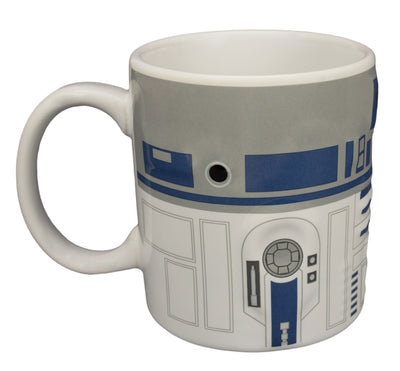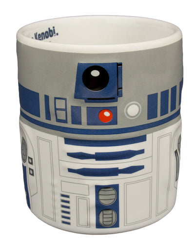 R2D2 has witnessed many wars and, more significantly: 6 movies! By now, the seemingly ageless robot shows the traces of time, as he is quite dented. This condition has been impressively replicated on this mug - which does not detract from R2's charm, quite the opposite, it makes him even more interesting.