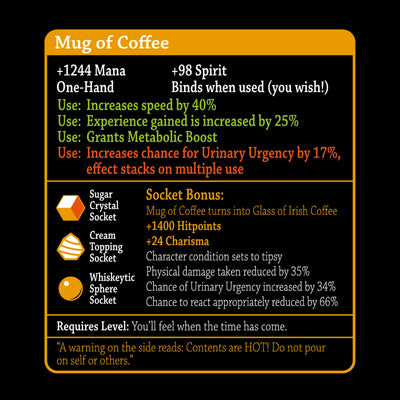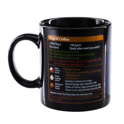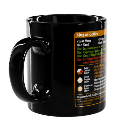 So, what are the special properties of the Mug of Coffee? First of all, the most important, +1244 Mana and +98 Spirit. It's clear that your mind becomes quicker with coffee. Of course, the effect improves with the right socketing. A bit of sugar works wonders, while whiskey carries some risks... And remember: the more coffee you drink, the more often you'll need to take a forced break. ;)