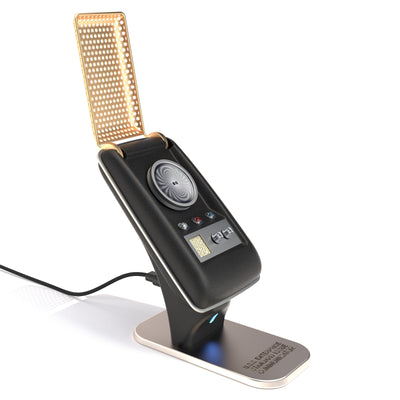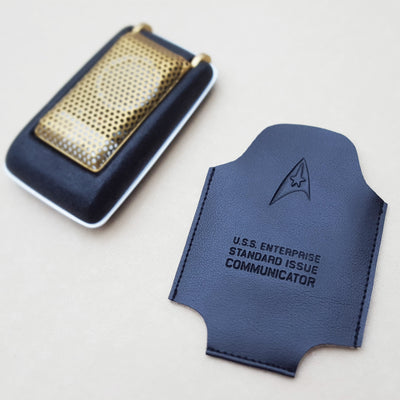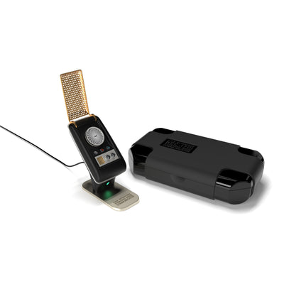 In collaboration with The Wand Company the Star Trek TOS communicator has now been created based on a 3D scan of the last surviving original communicator. You can connect this handy device to your smartphone or other devices via Bluetooth to make phone calls in the style of the Enterprise crew. In addition to the communicator, which is the most detailed replica on the market, you will also receive a charging station in Star Trek design, which you can use to charge the communicator wirelessly. To ensure that your new favorite device is well protected in all situations, the box also includes a carrying case and a leatherette cover with a special embossing.