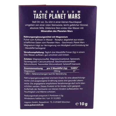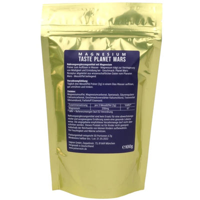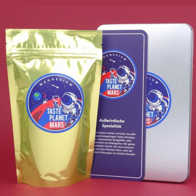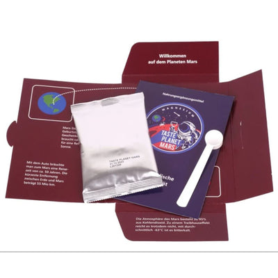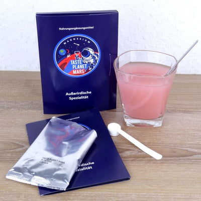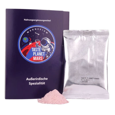 This mineral powder consists of only ingredients that have been proven to exist on Marsincluding magnesium and various mineral salts. It is ideal for mixing with water or other liquids, with the iron oxide contained in the powder giving the drink a Martian red color. For example, the powder can be used for the colorful "Mars Rendezvous" cocktail, for which you only need to add a little sparkling wine or mineral water and Blue Curaçao syrup. Of course, you can also come up with your very own drink creations with this interstellar food supplement! Such Martian drinks not only look good, but can also help to reduce fatigue thanks to the magnesium they contain.