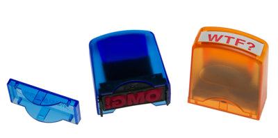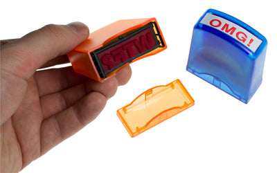 The TXT Stamps are self-inking and therefore do not require an ink pad. Both are filled with red ink. The housings of the stamps are made of orange or blue plastic and have a protective cap that should be removed, and the stamps should be stored upright so that the ink can flow well. The TXT Stamps are only available as a set of two, each with one OMG! and one WTF? stamp.