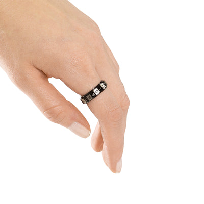 With the W20 dice ring for RPG and tabletop your tortured back can breathe a sigh of relief! This stainless steel ring has a rotating outer ring that shows the numbers from 1 to 20. So gone are the days of W20s flying and rolling everywhere: Just get the ring spinning and wait for a square to come to a stop in the marked area. Of course, the dice produces statistically fair results! And the best thing is that it doesn't need any lubricants, so you can simply clean it with soap and warm water if a bit of black fur blood drips onto it ;)