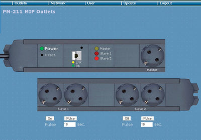 This power strip features an Ethernet interface and an integrated web server, allowing two of the four slave sockets to be switched on or off individually. This can be done via WWW or via mobile phone using WAP. It is possible to set up multiple users with different switching rights.