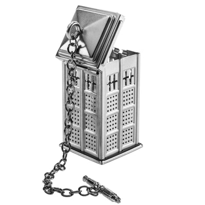 Para la dosificación perfecta, esta pequeña TARDIS de metal se encarga de todo. El techo se puede abrir y el infusor de té se llena fácilmente. Luego, simplemente cuélgalo en un recipiente adecuado - una jarra de vidrio se ve genial - y déjalo reposar durante 3-5 minutos. Todo se trata de la medida correcta de espacio y tiempo. ;) Por cierto, el mango al final de la cadena tiene la forma de un pequeño destornillador sónico.