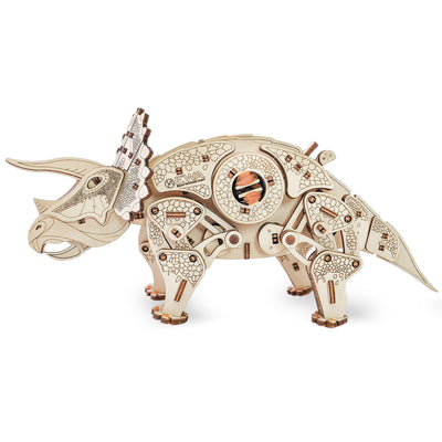 Mientras esperamos, podemos pasar el tiempo con el Kit de Madera Eco-Wood-Art „Triceratops“: Este kit contiene piezas de madera cortadas con láser, con las que se puede ensamblar un modelo detallado de un Triceratops. ¿Y lo mejor? ¡El Dino incluso puede caminar! Una vez que hayas dado cuerda al motor de banda elástica incorporado, el Triceratops comenzará a caminar alegremente por ahí!