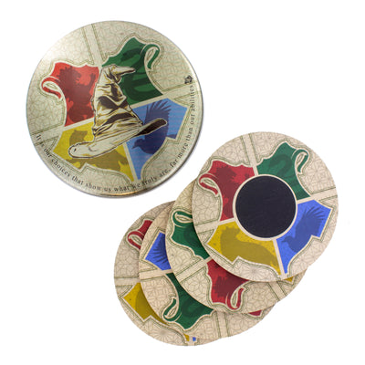 Este set viene en una caja de metal decorativa y contiene cuatro posavasos de colores con diseño de Hogwarts. En cuanto se coloca una bebida caliente (o mejor aún: una taza con una bebida caliente) sobre ellos, aparece en el centro de cada posavasos uno de los cuatro escudos de las casas, asignándote así a Gryffindor, Hufflepuff, Ravenclaw o Slytherin. ¡De esta manera estarás perfectamente preparado para la verdadera ceremonia, y tu mesa estará protegida de manchas!