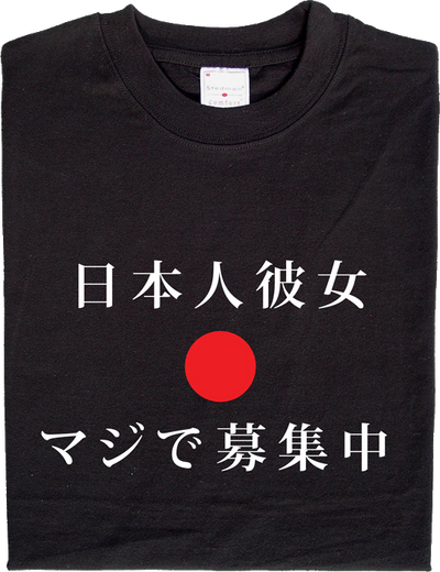 Una camiseta de nuestra colección para fanáticos de Japón: Los kanjis (caracteres japoneses) en esta camiseta se leen "Nihonjin kanojo majide boshuchu", lo que (en orden) significa "japonés", "novia", "seriamente" y "buscado". En conjunto, "Buscando seriamente una novia japonesa".
