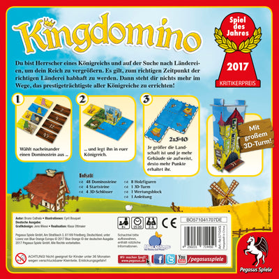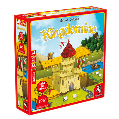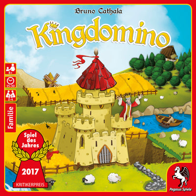 Bei diesem Spiel musst du als mittelalterlicher Herrscher dein Königreich (englisch: Kingdom) vergrößern, indem du „Landschaftsplättchen“ aneinander legst. Nur Plättchen mit dem gleichen Muster können aneinander gelegt werden, wie beim Domino. So ergibt sich der Name Kingdomino, offizielles Spiel des Jahres 2017!