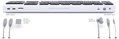 Para completar el Optimus Maximus, cuenta con dos puertos USB 2.0 y una conexión para un K-Lock. El teclado también requiere una fuente de alimentación separada de 100-240V (red europea o estadounidense), para la cual se incluyen varios adaptadores, asegurando la conexión en Europa y los EE. UU.