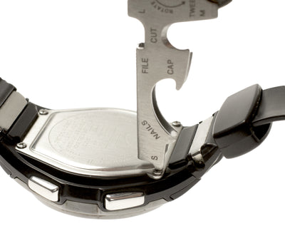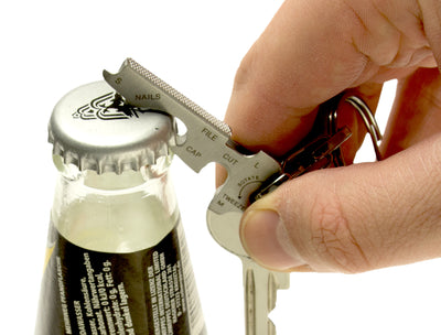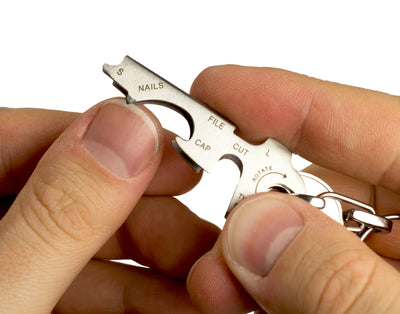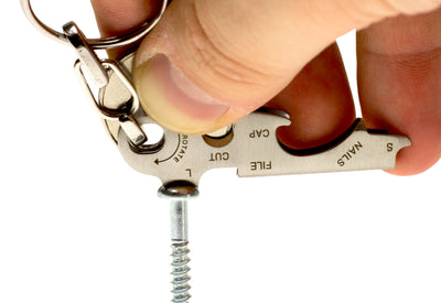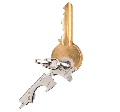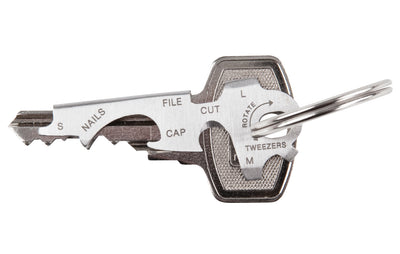 La herramienta clave es una pequeña herramienta multifunción de 8 pulgadas que simplemente pone en su llave. Por lo tanto, no ocupa ningún espacio adicional y siempre lo tiene con usted cuando sale de la casa.