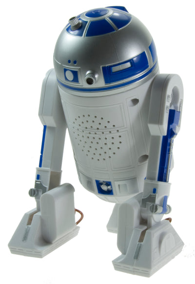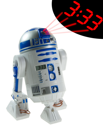 El despertador R2D2 cuenta con una pequeña pantalla LCD que muestra la hora actual y, al presionar un botón, la hora de la alarma actual. Al presionar otro botón, se activa el dispositivo de proyección, que proyecta la hora en una pared blanca cercana. La distancia ideal a la pared es de 2 metros. Al llegar la hora de la alarma, la proyección se activa automáticamente y suenan los típicos sonidos de R2D2.