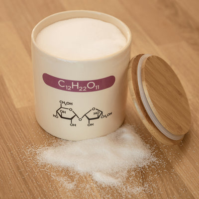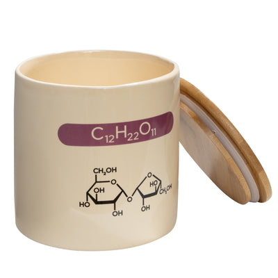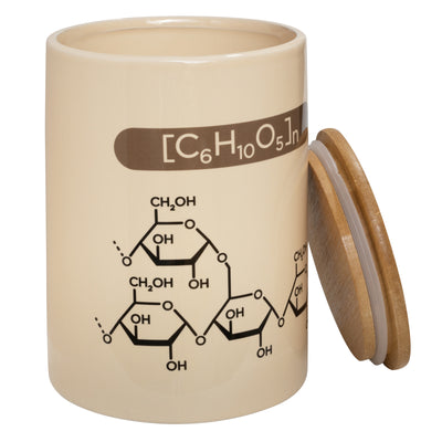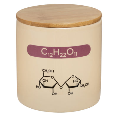 • Contenedores de almacenamiento de cerámica para sal, azúcar y harina en diferentes tamaños; -; Cada contenedor de almacenamiento está etiquetado con la fórmula química para su contenido; -; Los botes de harina y azúcar también muestran la fórmula estructural; -; Las tapas son de bambú y están equipadas con un práctico sello de silicona
