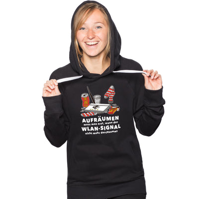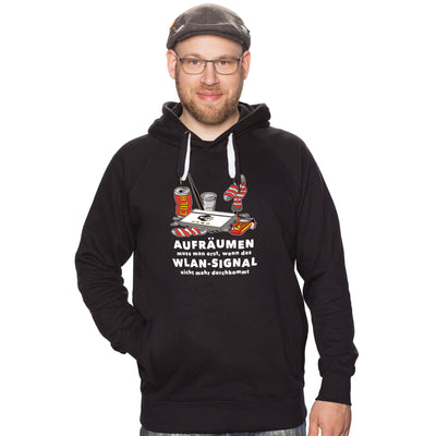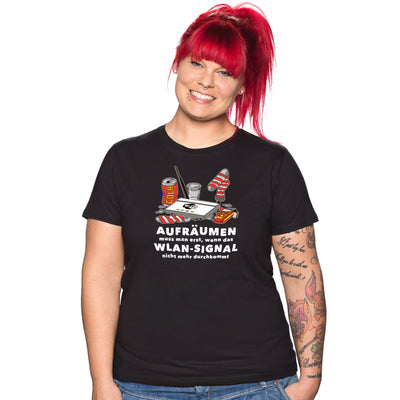 Y también controlamos rápidamente las demás cosas, como muestra la camiseta de "señal de WiFi": En cuanto la señal de WiFi no atraviesa el desorden, ¡mutamos en verdaderos fanáticos del orden! Las cajas de pizza se ordenan rápidamente por servicio de entrega y fecha, las bolsas de papas fritas se doblan y las latas de bebidas energéticas se convierten en una réplica de la USS Enterprise NCC-1701. Eso es exactamente lo que se entiende por orden, ¿verdad?