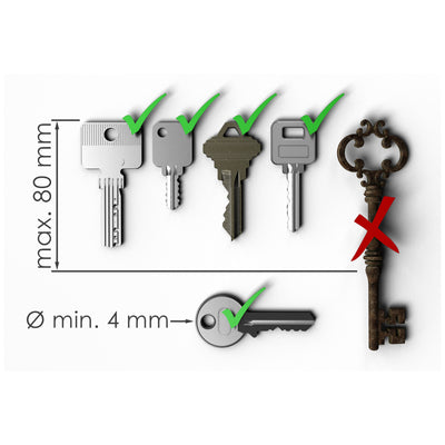 tenga en cuenta: Según el fabricante, Miracle Key solo es compatible con teclas que tienen un máximo de 80 mm de largo y tienen un diámetro de orificio de al menos 4 mm. Por supuesto, puede perforar el agujero por su propia responsabilidad o acortar la clave, pero la experiencia ha demostrado que los propietarios no están demasiado entusiasmados al respecto. ;)