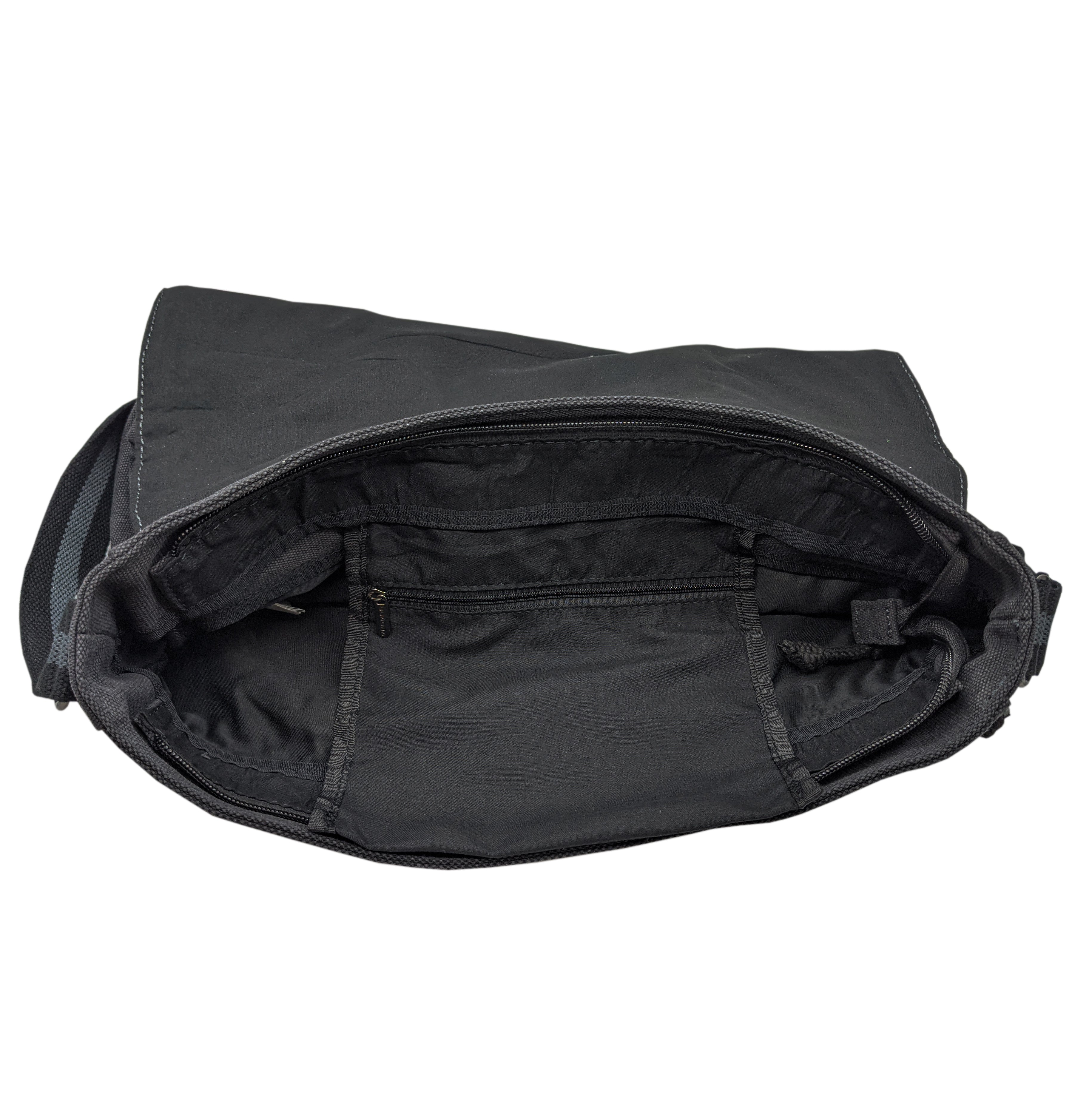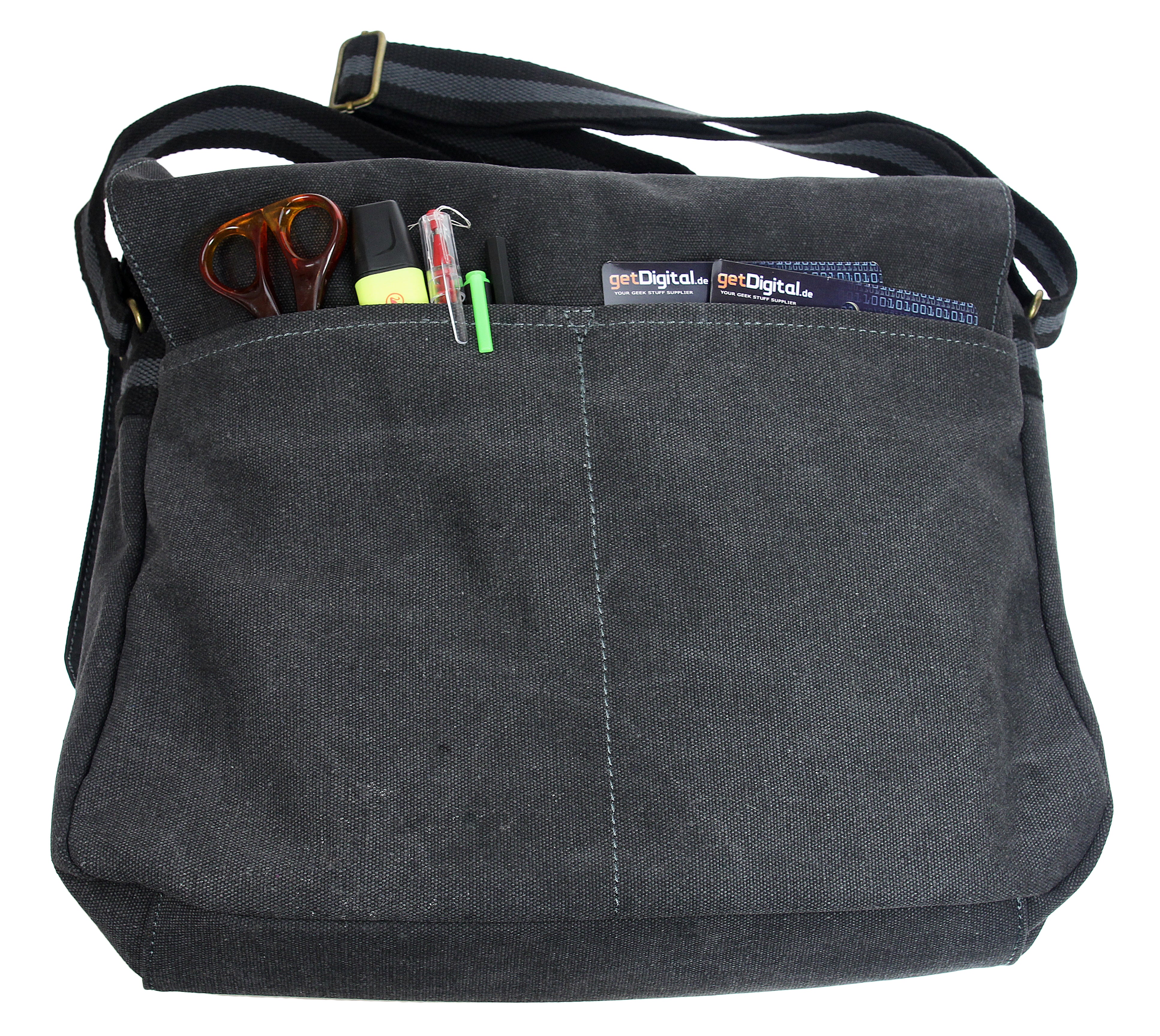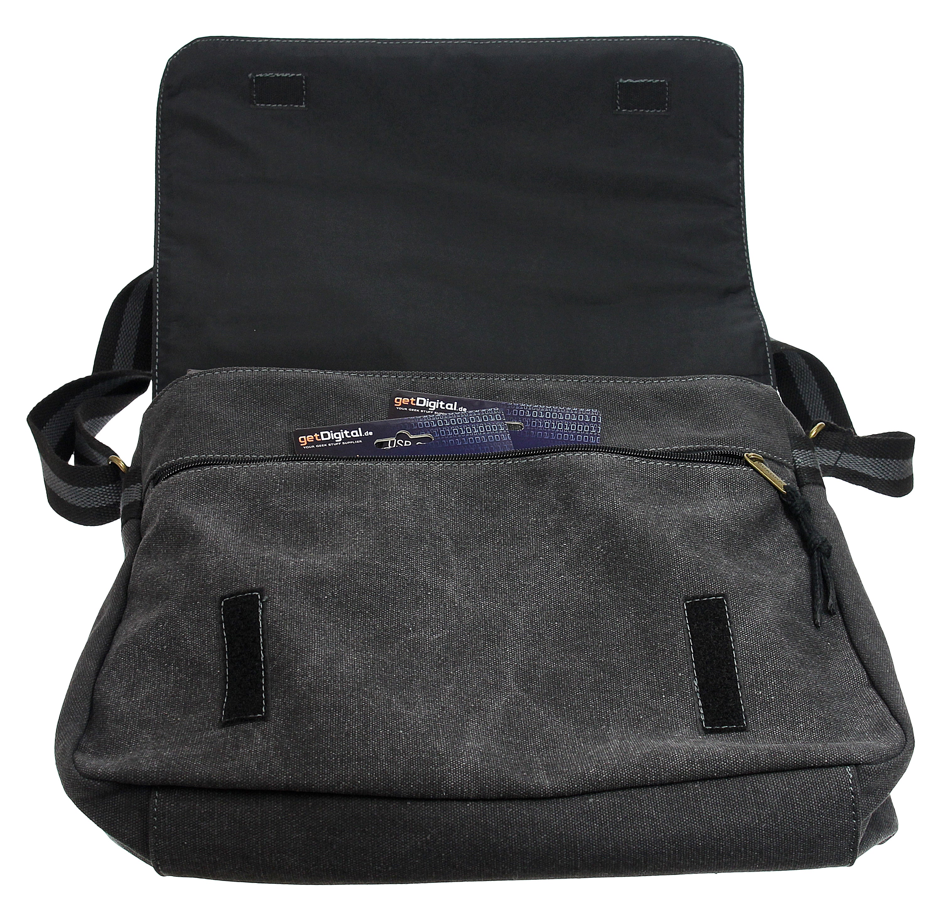 5 compartiments : compartiment principal avec fermeture éclair et petite poche intérieure avec fermeture éclair supplémentaire, poche avant avec fermeture éclair et deux poches plaquées à l'arrière. Autres caractéristiques : rabat avec fermeture velcro et bandoulière réglable. Couleur noir/anthracite. Dimensions : env. 35 x 29 x 6 cm (par exemple pour ordinateur portable jusqu'à 15,6" ou classeur A4 Leitz)