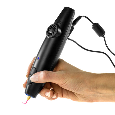 Le câble de la pédale se branche à l'arrière du 3Doodler, à côté de l'alimentation électrique. La pédale remplace maintenant les deux boutons pour la distribution rapide et lente du plastique. Pour retirer les bâtonnets de couleur, les deux boutons sont pressés simultanément - exactement comme sur le 3Doodler lui-même. Vous protégez ainsi vos doigts et êtes prêt à l'emploi plus longtemps. De plus, le contrôle via la pédale offre plus de flexibilité, car le 3Doodler lui-même peut être guidé plus facilement lorsque vous n'avez pas à appuyer sur les boutons avec vos doigts. Cela facilite également le travail à une main.