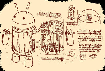 Si Léonard de Vinci avait vécu 500 ans plus tard (ou si le smartphone avait été inventé 500 ans plus tôt) ;) et s'il avait dû créer la mascotte Android, alors... oui, alors les premières tentatives auraient peut-être ressemblé à cela, comme sur ce Android da Vinci T-shirt.