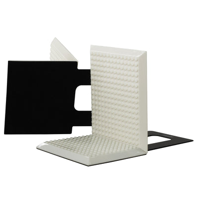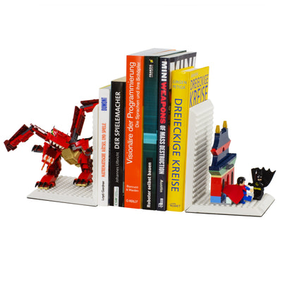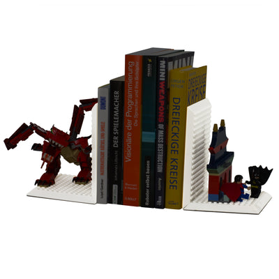Pour éviter que ta première édition signée, ton livre préféré d'enfance ou le dernier best-seller de fantasy ne bascule et ne soit endommagé, tu devrais envisager d'utiliser des serre-livres. Avec les serre-livres en blocs de construction, tu peux maintenir ta bibliothèque personnelle en place et également la mettre en scène avec des blocs de construction ! Aux extrémités des supports stables se trouvent des tenons compatibles avec les systèmes de blocs de construction courants comme LEGO. Tu peux ainsi adapter tes étagères à chaque situation : beaucoup de littérature fantastique en ce moment ? Place un dragon sur le serre-livres. Complètement en mode SciFi ? Essaie avec un vaisseau spatial.