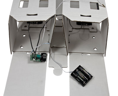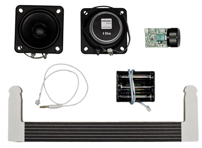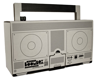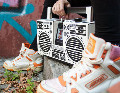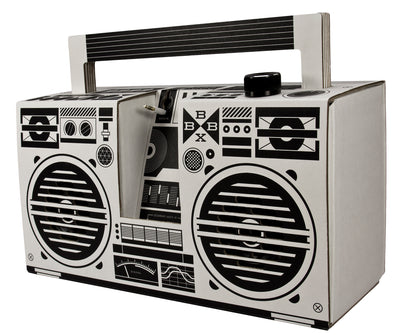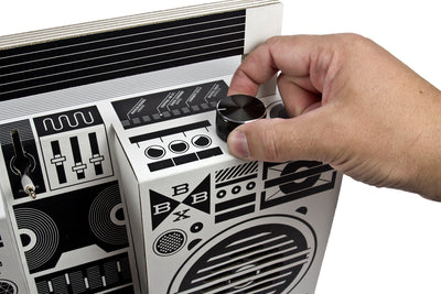 Le kit est bien sûr accompagné d'un mode d'emploi, de sorte que tu ne sois pas complètement dans l'obscurité lors de l'assemblage des pièces en carton et de l'installation des haut-parleurs de classe D de 2x5 watts. Mais ne t'inquiète pas, la colle ou d'autres outils ne sont pas nécessaires et le montage se fait en peu de temps. Si tu n'aimes pas le noir et blanc, tu peux bien sûr peindre toi-même le Boombox Berlin ou l'embellir avec des autocollants.