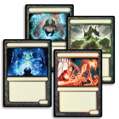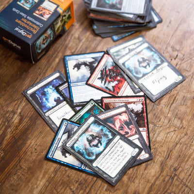 Auf den 100 doppelseitig bedruckten Karten, die in der Größe dem gängigen Sammelkartenformat entsprechen, kannst Du mächtigen Magiern dabei zusehen, wie sie Kreaturen erschaffen und auf ihre Gegner hetzen. Die restlichen Felder der Tokenkarten sind frei, sodass Du selbst eintragen kannst, welche Werte, Fähigkeiten und Namen Deine Kreaturen haben. Wir haben uns bewusst für doppelseitig bedruckte Karten entschieden, da man Token nicht auf der Hand hat und so nicht unnötig Platz auf der Rückseite verschwendet wird. Bei den Farben haben wir uns an den gängigen Arten von Mana in Magic: The Gathering orientiert, lediglich blau und weiß müssen sich eine Karte teilen, da 5 sich schlecht durch 2 teilen lässt. ;)