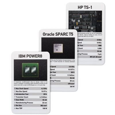 Peut-être avez-vous déjà disputé quelques rounds de CPU Wars 1.0 ? Voici du renfort, cette fois sous la forme de serveurs des 30 dernières années. Comme dans tout jeu de quartet normal, il s'agit d'obtenir la valeur la plus élevée dans une catégorie ou de constituer un quartet. Sauf que ce jeu de cartes ne tourne pas autour de pelleteuses ou d'animaux ennuyeux, mais autour des CPU de serveurs. Une petite sélection des 30 cartes est montrée sur les photos.