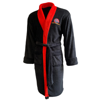 Da hilft nur ein Bad, bei dem du dir die Überreste deiner Feinde in Ruhe abwaschen kannst, und danach der Mortal Kombat Bademantel. Er passt so ziemlich allen Spielern (es sei denn, du hast Molochs Statur oder Goros Arme), verfügt über zwei praktische Taschen und einen Gürtel. Das Beste ist aber natürlich das große, farbige Mortal Kombat-Logo auf dem Rücken, dicht gefolgt von dem kleinen Logo auf der Brust und dem roten Aufschlag.