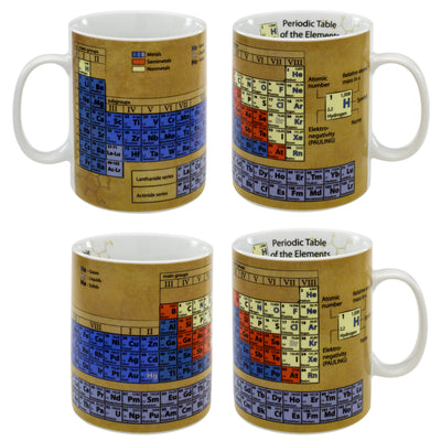 La tasse de chimie montre - comment pourrait-il en être autrement - bien sûr le tableau périodique. Pour tous les débutants ou ceux qui ont abandonné la chimie trop tôt et le regrettent amèrement maintenant, une légende est également incluse. Exactement, la grande lettre est le symbole de l'élément respectif. ;)