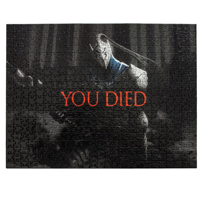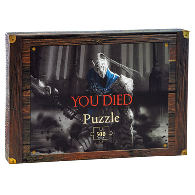 Le Puzzle "Tu es mort Cependant, les vétérans du jeu et les personnes non traumatisées auront un grand défi à relever. Avant de pouvoir voir le fameux chevalier au bras paralysé du jeu, tu dois d'abord assembler correctement les 500 pièces. Et tu peux nous croire : ce n'est pas si facile. Et fais attention : Le bord de la boîte indique qu'il s'agit d'une mimique. Alors n'y touche pas !)