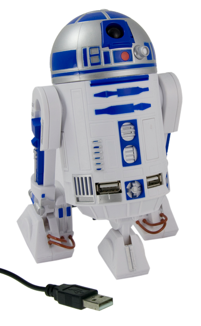 Ce hub USB en forme du célèbre robot de Star Wars ne doit bien sûr pas manquer sur un véritable bureau de geek. La réplique sous licence de R2D2 des films Star Wars vous offre 4 ports USB 2.0 dès que vous le connectez à votre ordinateur via USB. En appuyant sur un bouton, R2D2 émet également les sifflements typiques de ce type de robot.