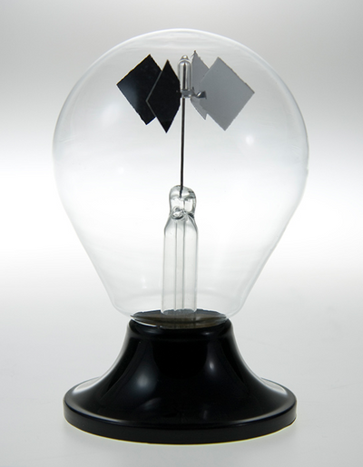 Les quatre ailes du rotor sont de petits disques, peints en blanc d'un côté et en noir de l'autre. L'explication de la rotation constante est que les côtés noirs se réchauffent plus rapidement que les côtés blancs, ce qui réchauffe également l'air de ce côté. Les particules dans les gaz chauds (et l'air est un gaz) se déplacent plus rapidement que dans les gaz plus froids et elles frappent donc plus souvent et plus fort les disques, ce qui provoque la rotation.