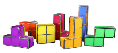 Comme dans Tetris, chaque brique est composée de quatre carrés (un carré mesure 4x4x4cm, par exemple la brique "L" mesure 12cm de haut et 8cm de large). Avec les sept blocs, tu peux faire beaucoup de choses différentes. Motifs de lampes Crée des formes. Une fois que tu as branché la brique bleue (souvent appelée stick) sur le courant et que l'interrupteur est sur "ON", les LED intégrées s'illuminent et ton monde brille de mille feux ! Mais seulement si les briques se touchent, car une brique Tetris n'aime pas être seule et en désire d'autres (et en plus, il faut qu'il y ait du courant partout) ;) Nous avons expliqué les détails du fonctionnement sur le blog :)