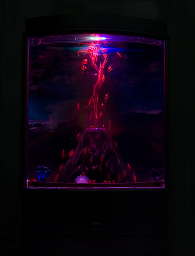 Tout d'abord, tu dois remplir le boîtier du volcan USB avec de l'eau. Ensuite, le petit modèle de volcan à l'intérieur du boîtier commence, en appuyant sur un bouton, à cracher de petites billes de plastique rouges qui redescendent lentement - presque comme la lave d'un vrai volcan. Les phases d'éruption et de refroidissement alternent : pendant la phase d'éruption, les billes rouges sont projetées vers le haut et pendant la phase de refroidissement, elles redescendent. De plus, l'intérieur du boîtier s'illumine en rouge lorsque le volcan entre en éruption et en bleu lorsqu'il se refroidit.