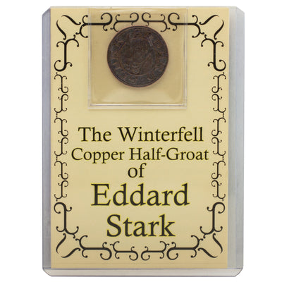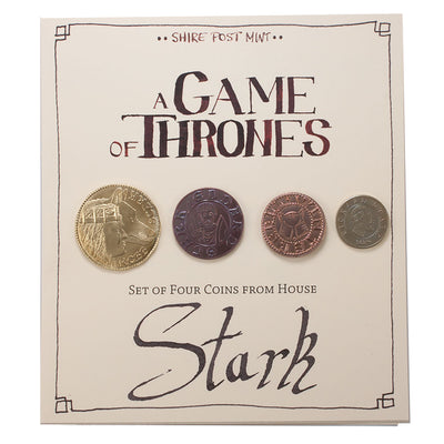 • Im "Haus Stark"-Set mit vier Münzen wurden Eddard, Rickard, Robb und Torrhen Stark zusammen mit ihren Düsterwölfen auf Kupfer und Messing verewigt.