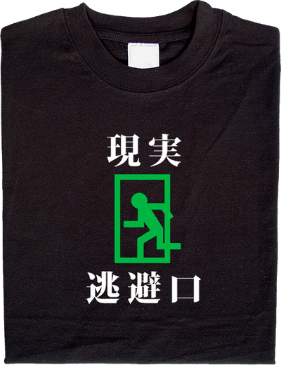 Una maglietta della nostra serie per i fan del Giappone: i kanji (caratteri giapponesi) su questa maglietta recitano "genjitsu tohi guchi", che significa (nell'ordine) "realtà", "fuga" e "uscita". In altre parole, "fuga dalla realtà". La maglietta perfetta per i fanatici del Giappone :)