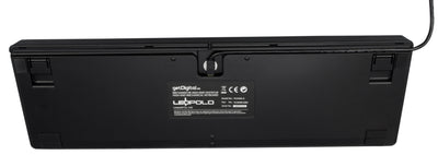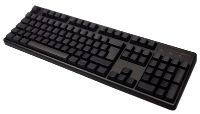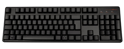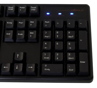 Il tastiera dal design semplice con LED blu sopra il tastierino numerico ha i soliti 105 tasti nel layout ASCII dell'UE, con una dimensione di circa 19 mm. Puoi anche scegliere tra i tasti etichettato e non stampati ("bianchi") a seconda della tua esperienza di digitazione.