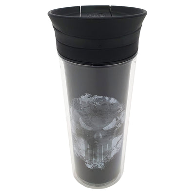 Der schwarze Becher mit Punisher-Logo hält dein Getränk warm und sieht auch noch cool aus.