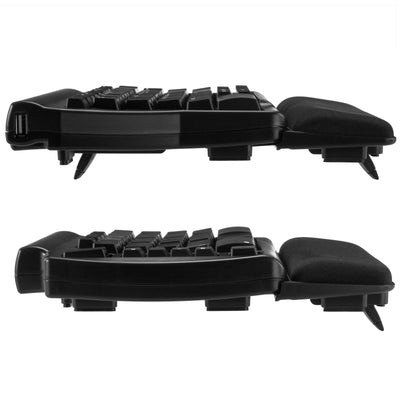 Entrambe le parti sono dotate di cuscinetti in gel per i palmi delle mani. Questo protegge i polsi e i nervi e le mani non si stancano così rapidamente durante la digitazione. Se preferisci digitare senza, puoi anche rimuovere i cuscinetti. Grazie ai piedini pieghevoli, la tastiera può essere inclinata in avanti, all'indietro o verso l'esterno di 4,5° o leggermente sollevata (vedi foto). La piastra in acciaio rende la tastiera particolarmente robusta.