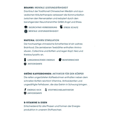 Ingredienti: Estratto di tè verde Matcha dalle foglie (Camellia sinensis) 43%, chicchi di caffè verde (Coffea arabica) 21%, estratto di Brahmi dalla pianta intera (Bacopa monnieri) 15%, antiagglomeranti (croscarmellosa sodica, biossido di silicio, stearato di magnesio), agenti di rivestimento (idrossipropilmetilcellulosa, idrossipropilcellulosa, microcristalli di cellulosa, trigliceridi), coloranti (coloranti naturali di mela, alghe rosse, cartamo, limone, ravanello, ribes nero), difosfato di ferro, pantotenato di D-calcio, aroma (menta naturale), cloridrato di piridossina, mononitrato di tiamina, cianocobalamina