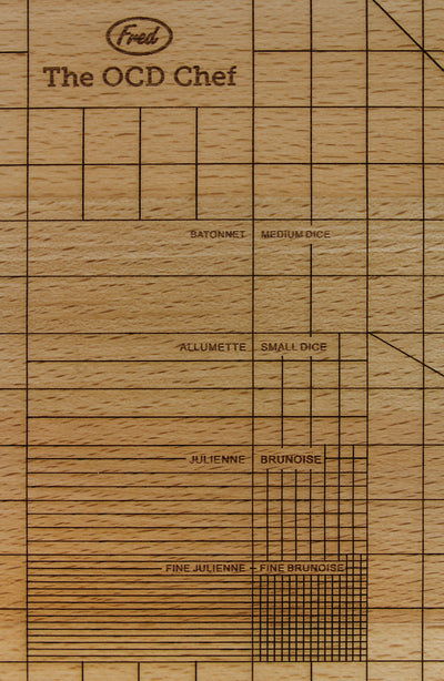 Il tagliere OCD (Obsessive Chopping & Dicing) in legno di faggio consente di tritare, affettare e tagliare con estrema precisione. Grazie alle linee predeterminate, puoi lavorare con la stessa precisione di una cucina professionale. Strisce di carote di dimensioni come Batonette, Allumette, Julienne e Julienne fine sono un gioco da ragazzi. L'abilità eccessiva è per i cubetti in Medio, Piccolo, Brunoise e Brunoise fine (chi avrebbe mai pensato che esistessero unità culinarie del genere nel settore della ristorazione!