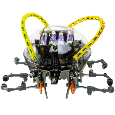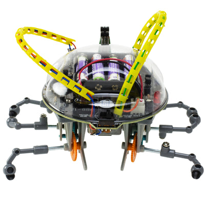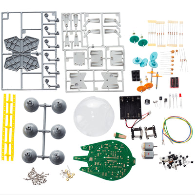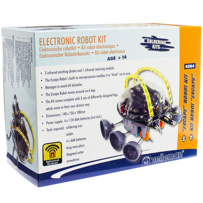 Con il kit robot, puoi costruire un robot in grado di muoversi con 6 ruote e di riconoscere gli ostacoli in modo indipendente. Utilizza tre trasmettitori a infrarossi e un ricevitore che, con l'aiuto del microcontrollore integrato, gli permettono di scansionare l'ambiente davanti a sé, riconoscere gli ostacoli ed evitarli.