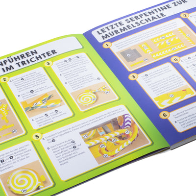 Le 84 pagine contengono tutti i pezzi pretagliati di cui hai bisogno per completare la pista di biglie. Un bastoncino di colla, due biglie e un po' di pazienza e la corsa sfrenata potrà iniziare. La pista comprende diverse attrazioni, come scale, interruttori, imbuti e persino un anello. Questi ostacoli fanno sì che non ci siano due corse uguali e che sia sempre incerto quale biglia alla fine si aggiudicherà il primo posto.