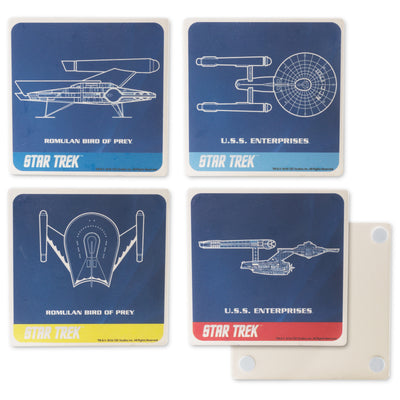 • Mostrano i seguenti motivi della serie Starship Enterprise: la USS Enterprise e un uccello rapace romulano da due angolazioni